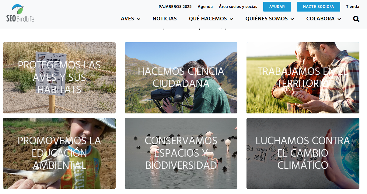 SEO tiene seis ejes de trabajo, que son proteger las aves y sus habitats, hacer ciencia ciudadana, promover la educación ambiental, conservar espacios y biodiversidad, y trabajar en el territorio.
